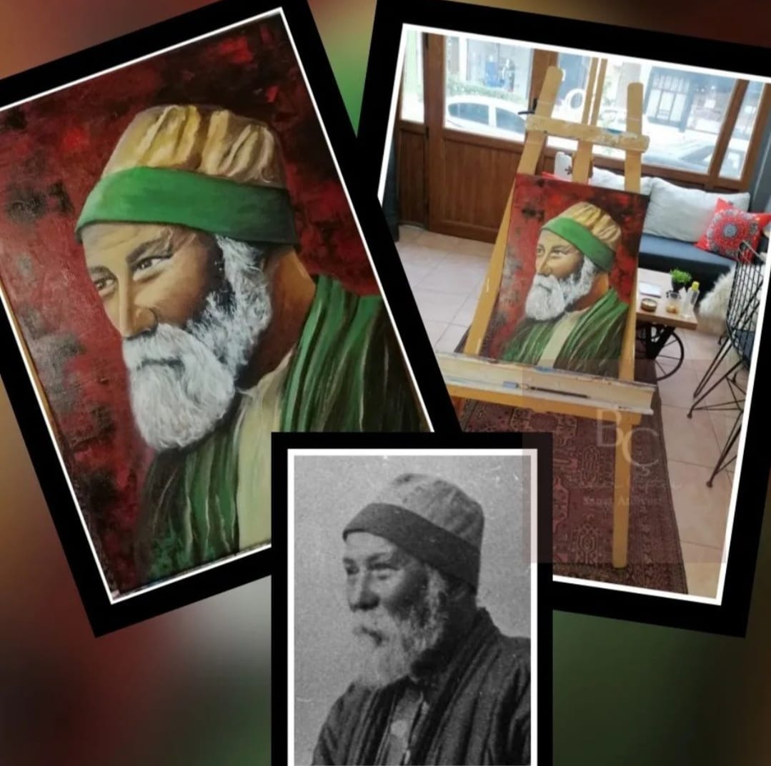 Bu eser, derin bir tefekkür halini yansıtan bilge bir yüzü öne çıkarıyor. Yeşil ve beyaz tonların hâkim olduğu giysiler, tasavvufun sadeliğini ve ruhsal aydınlanmayı temsil ederken, bakışlardaki dinginlik yüzlerce yıllık bilgelikten süzülen bir huzuru ifade ediyor.