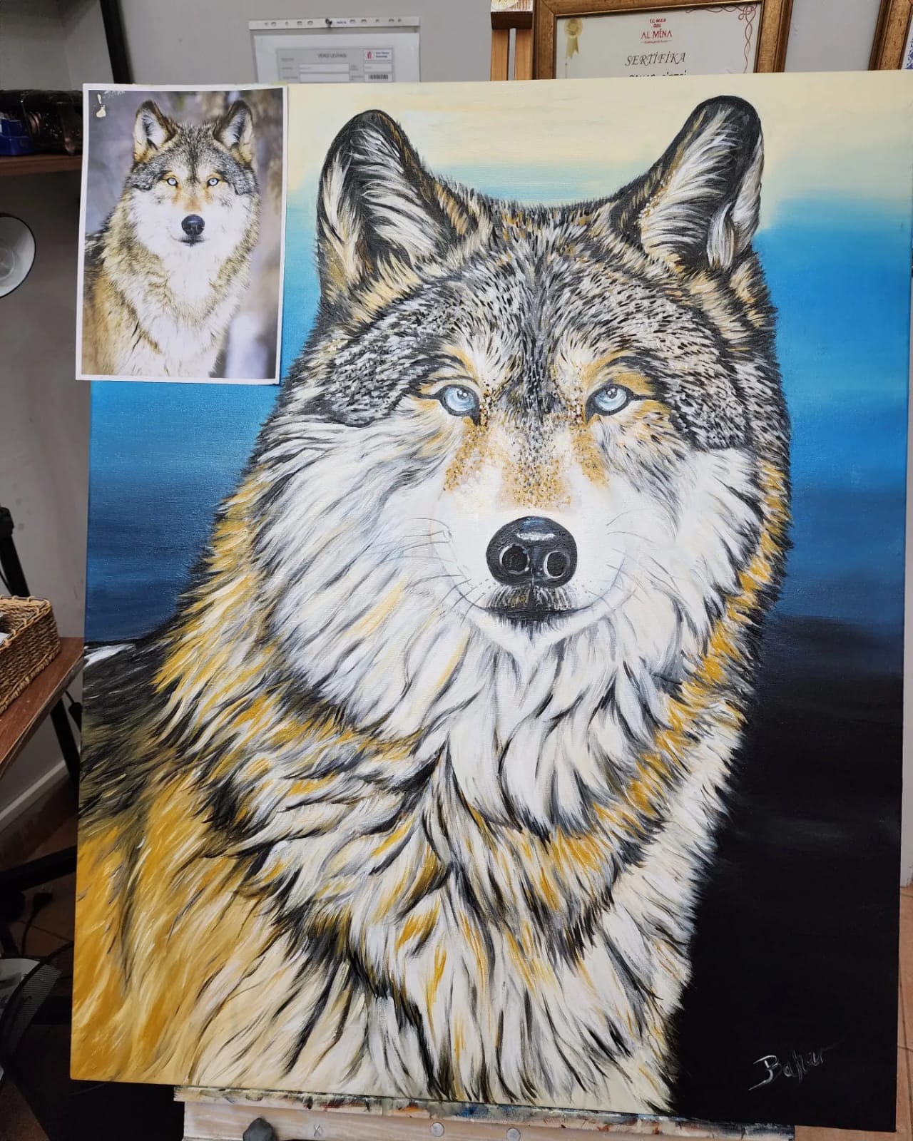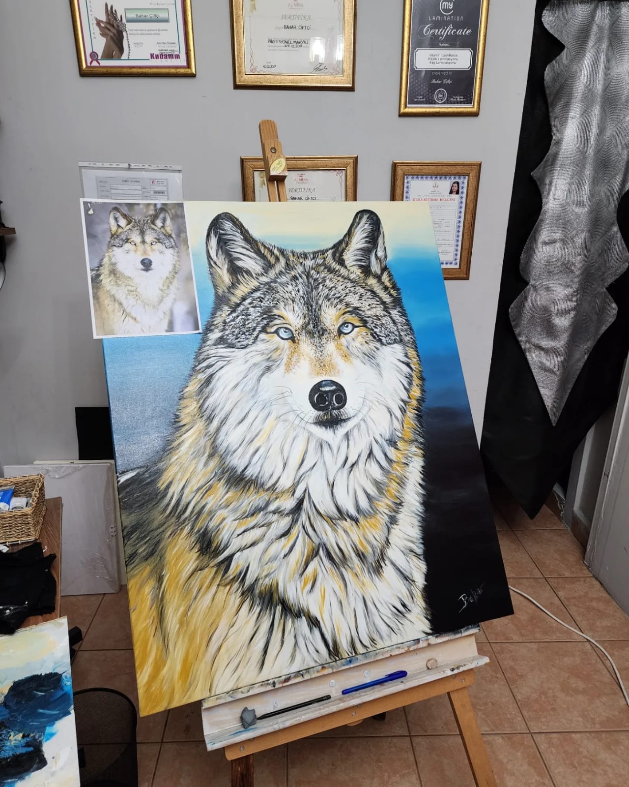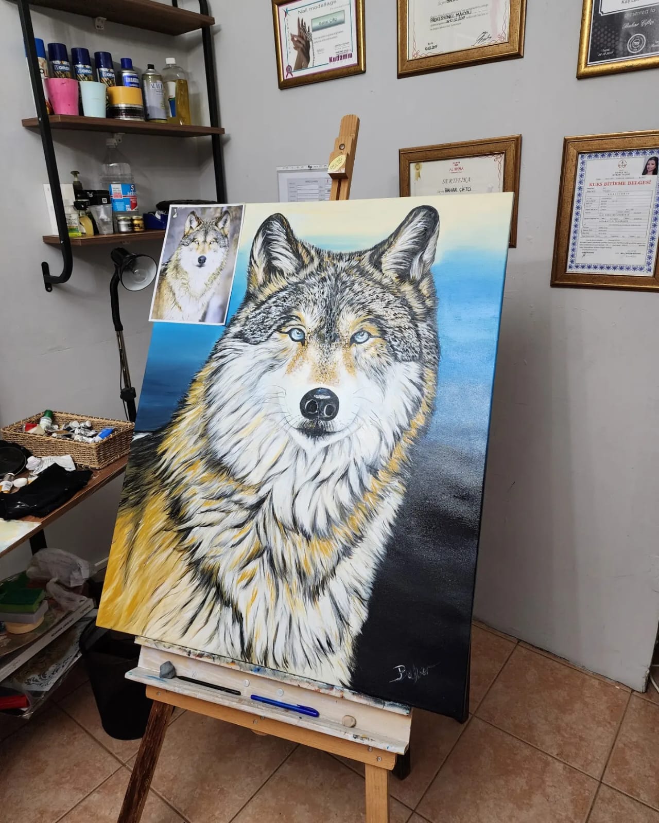 Tablonun merkezindeki kurt, buz mavisi gözleriyle sadece bakanı değil, bulunduğu ortamı da etkisi altına alır.