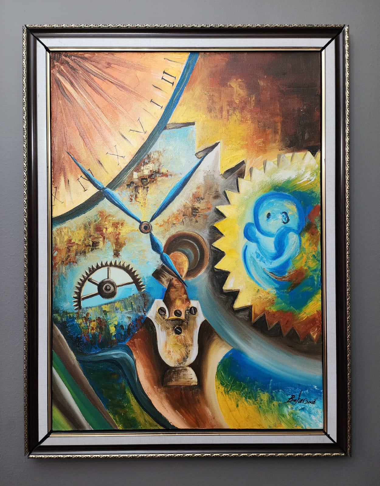 Üstteki klasik saat ve keskin dişli çarklar, zamanı bir makine gibi işleyen kaçınılmaz bir güç olarak resmederken; sağ taraftaki cenin figürü, yaşamın başlangıcına vurgu yapar.